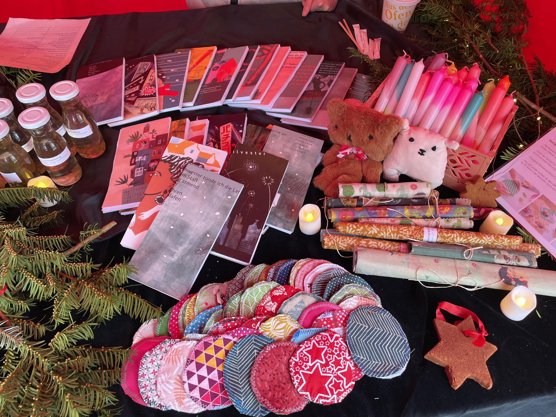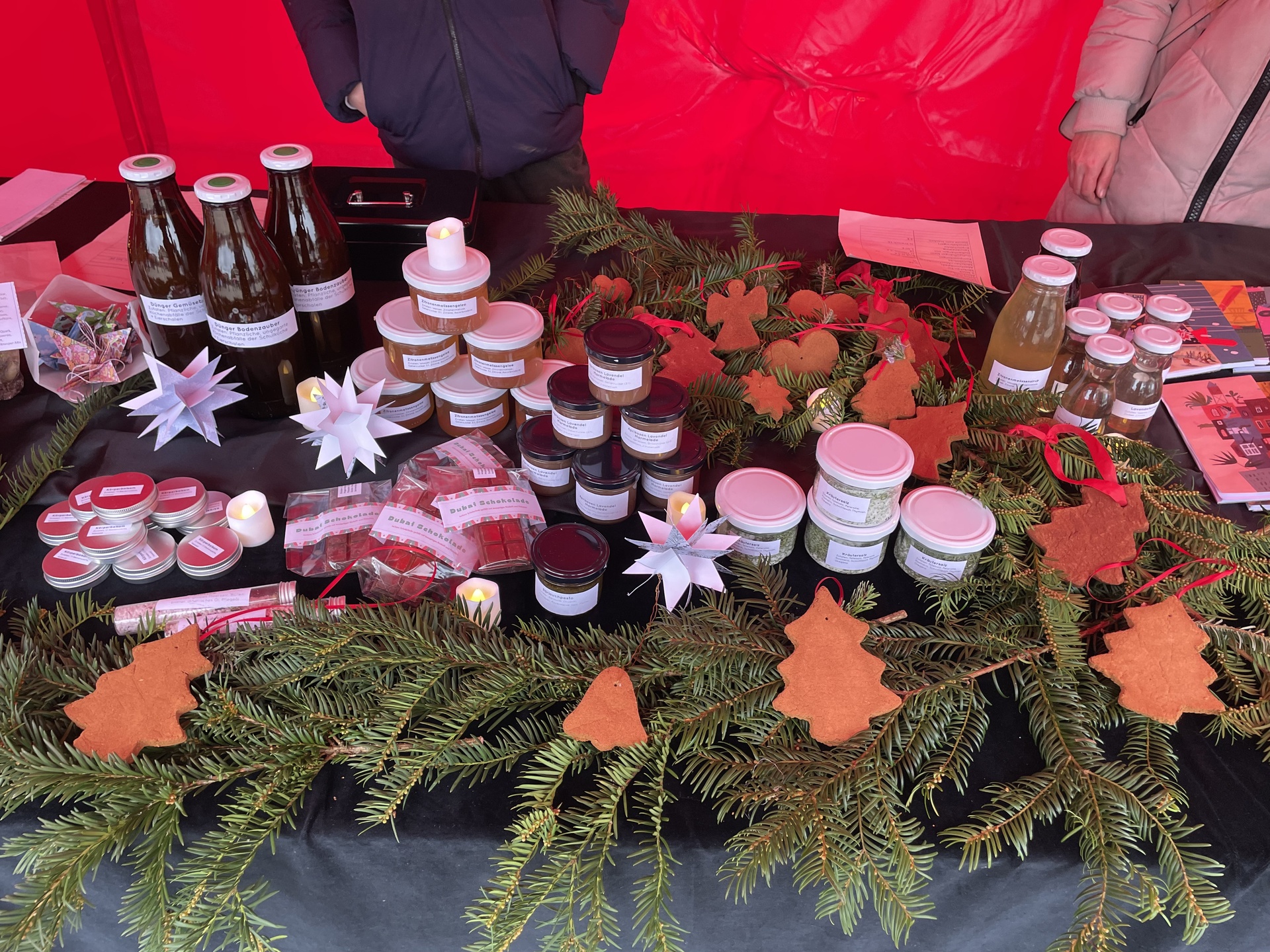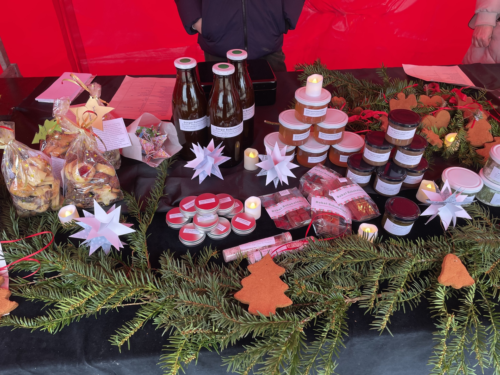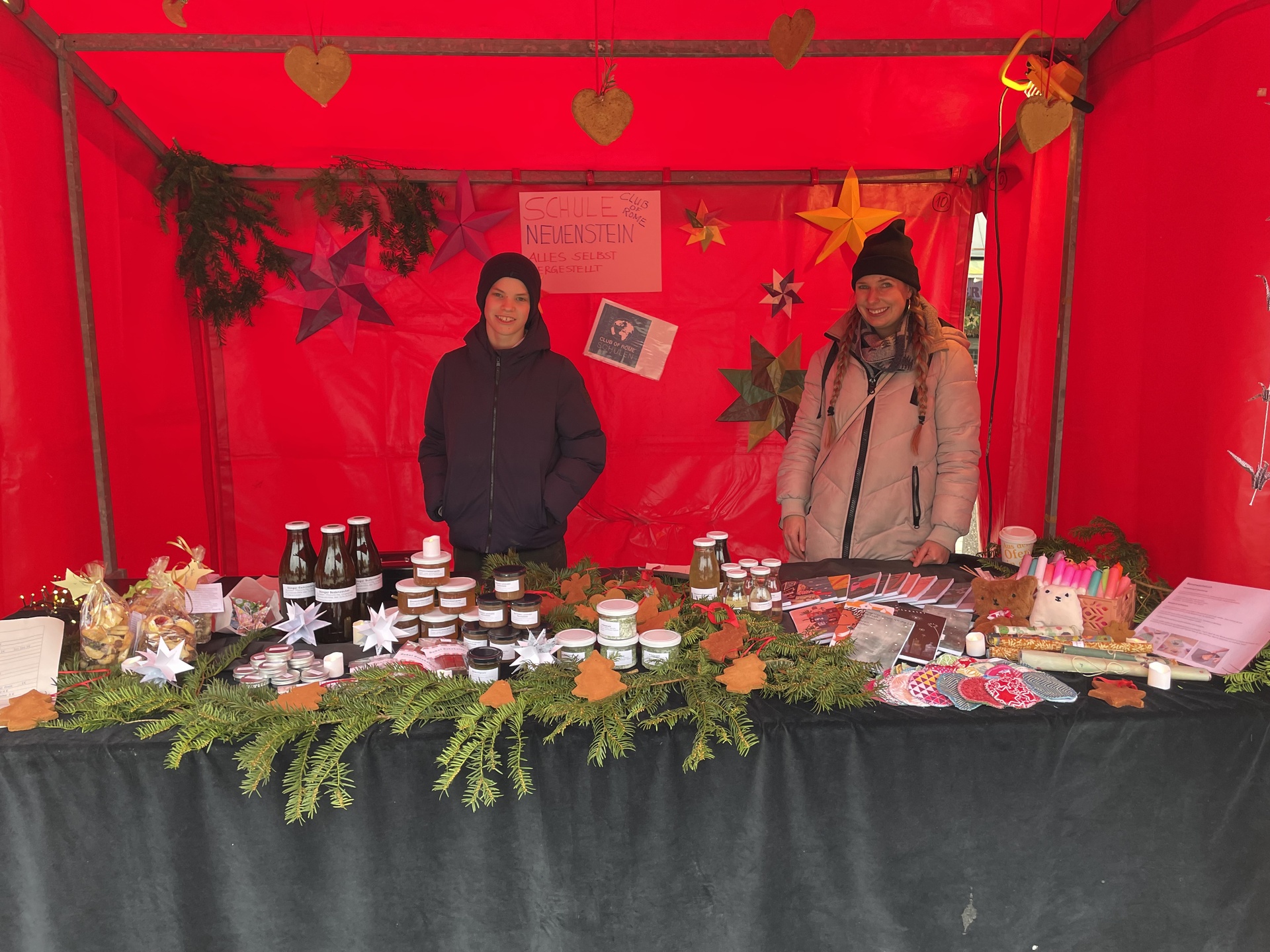 Das vielfältige Sortiment reichte von recycelten Produkten wie liebevoll gestaltete Notizblöcke aus Fehlkopien, Hautpflegeprodukten bis hin zu Bienenwachstüchern. Aus dem Kräutergarten stammten unter anderem aromatisches Kräutersalz, Kräutersirup und Kräutergelees. Ergänzt wurde das Angebot durch selbst gemachte Körperpflegeprodukte sowie dekorative Duftanhänger, die in einer AG in Kooperation mit dem Neuensteiner Pflegeheim entstanden sind. Die Bewohner des Pflegeheimes statteten dem Stand einen Besuch ab um zu sehen, wie ihre Produkte angenommen wurden.