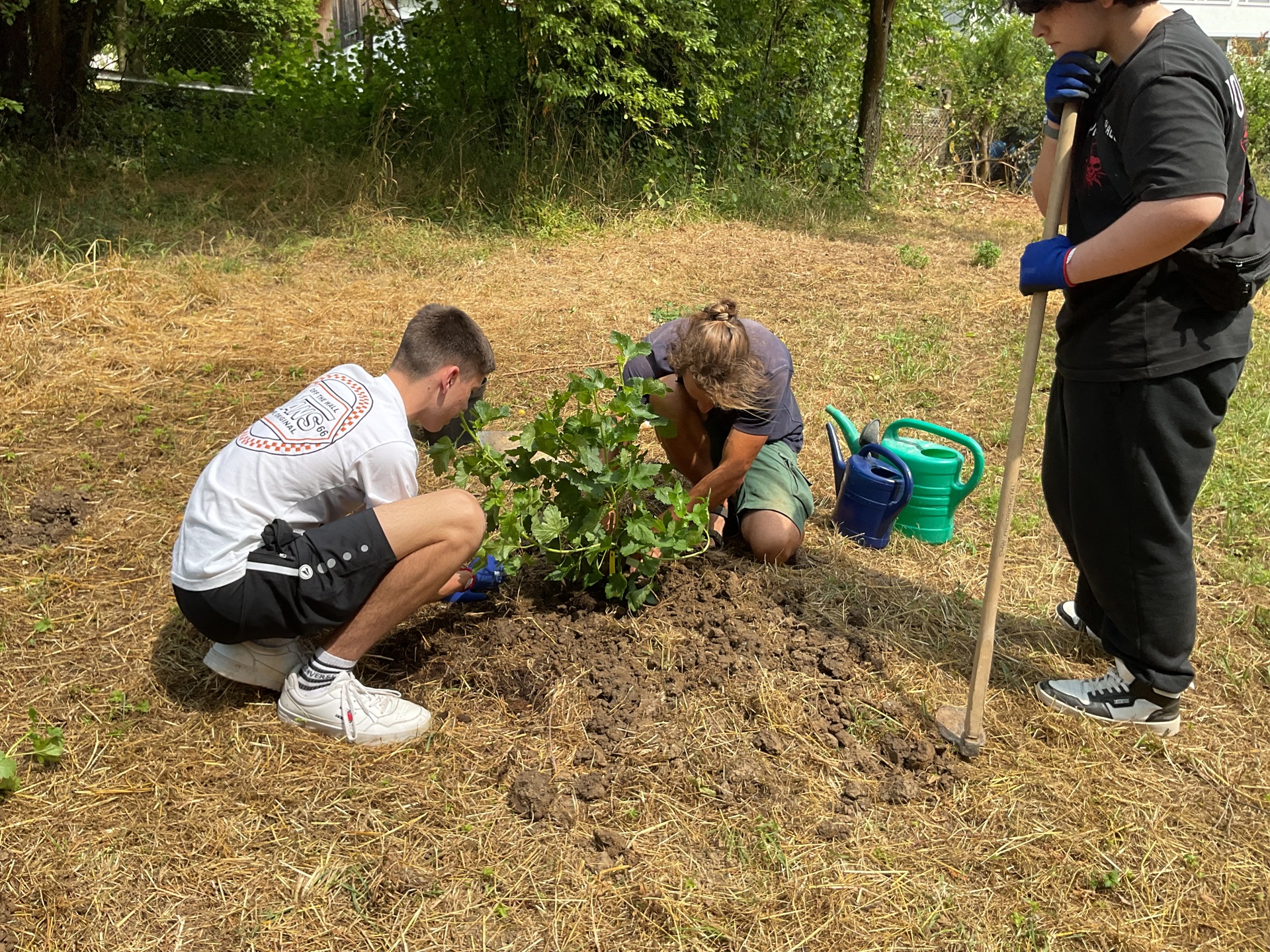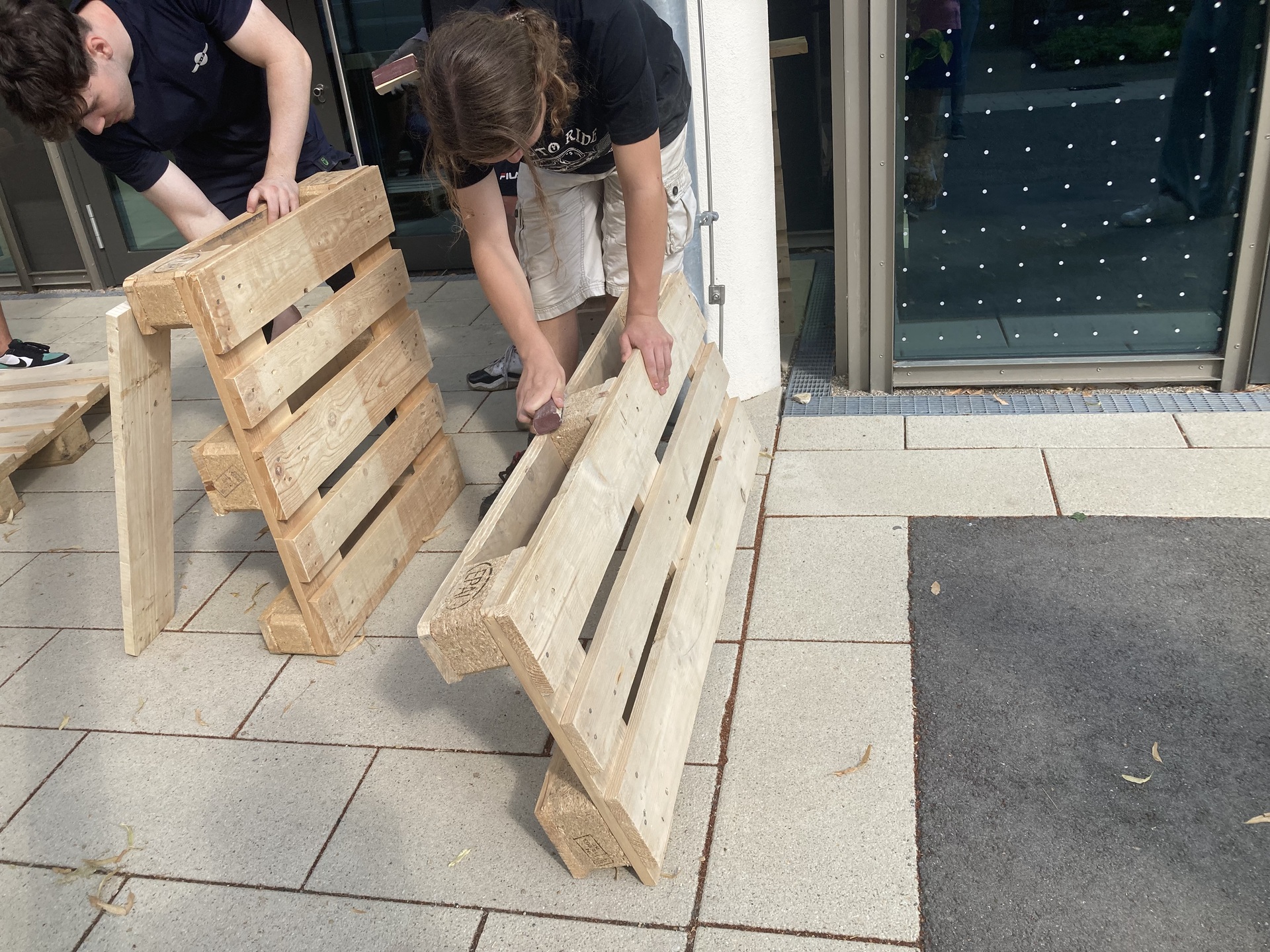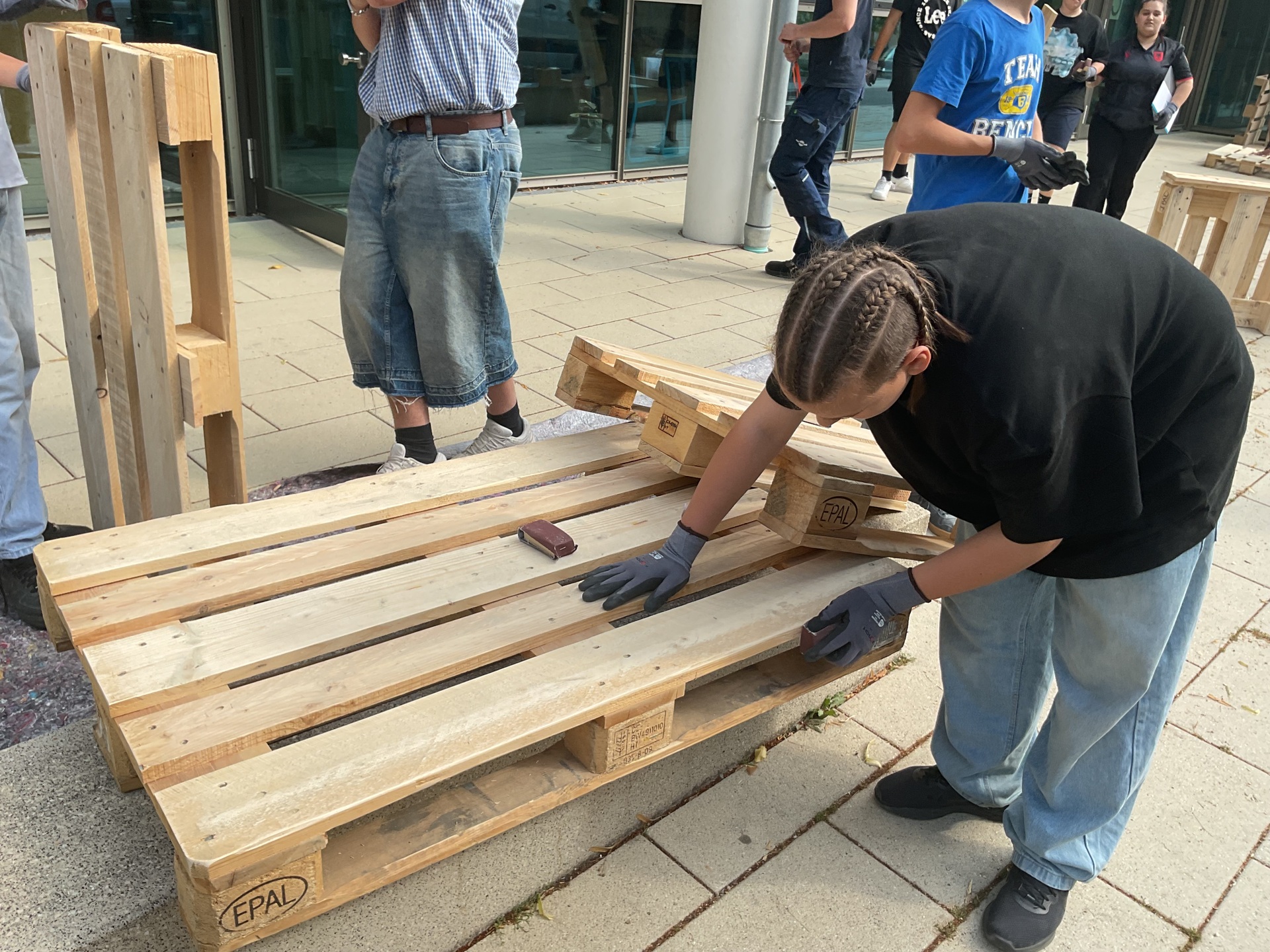 Der Projekttag bot ein vielfältiges und abwechslungsreiches Programm, das inhaltlich in verschiedene Themenbereiche gegliedert war und hier auszugsweise vorgestellt werden soll. Im Bereich Handwerk und Technik konnten die Schülerinnen und Schüler praktische Erfahrungen sammeln: So entstanden in Zusammenarbeit mit der Firma Schäfer und Peters GmbH aus Paletten Sofas für den Schulgarten. Auch das Bepflanzen von Motorgehäusen – unterstützt von der Firma Magna – war Teil des Programms. Darüber hinaus wurden kleine Möbelstücke aus Holz und recycelten Materialien gefertigt. Musikalisch Interessierte hatten die Möglichkeit, eine Cajon, ein hölzernes Schlaginstrument, selbst zu bauen und direkt auszuprobieren. Außerdem wurde ein Insektenhotel gebaut, das Lebensräume für nützlichen Insekten schafft.