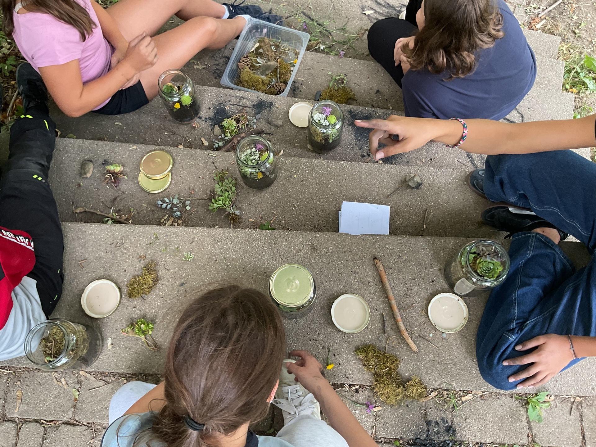 Im Bereich Kunst und Kreatives konnten sich die Teilnehmenden künstlerisch ausleben: Beim Töpfern entstanden Vogeltränken, Insektenbrunnen und andere nützliche oder dekorative Objekte. Auch ein „Garten im Glas“ – ein kleines, tragbares Ökosystem – wurde mit viel Liebe zum Detail gebastelt. Aus Naturmaterialien wie Blumen, Steinen oder Ästen entstanden fantasievolle Collagen und beim Upcycling-Projekt wurden alte Kleidungsstücke kreativ umgestaltet und aufgewertet.
